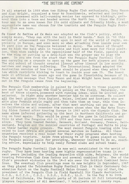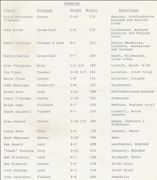 Ray McLoughlin (Capt - Athlone, Ireland & British and Irish Lions), Colin McFadyen (V Capt - Moseley, England & British and Irish Lions), Charles Prewer (Sidcup), John Allen (Leicester & Midlands) Tony Bucknall (Richmond & England), Gerry Culliton (Wanderers & Ireland), Martyn Davies (Neath & Wales trialist), Cyril Evans (Newbridge & Wales trialist), Alex Finlayson (Cardiff & Wales B), Jim Flynn (Wanderers & Leinster & Ireland), Kevin Flynn (Wanderers, Leinster & Ireland), John Hennigan (Blackheath), Brian Keen (Moseley & England), Kevin McGowan (Glamorgan Wanderers & Leinster), Terry O’Gorman (Glamorgan Wanderers), Brian Page (Bedford & England trialist), Derek Quinnell (Llanelli & Wales U21), Alan Raines (Wasps & Middlesex), Peter Rees (Newport & Wales), Mark Robinson (Bath), Bob Rowell (Leicester & England), Stack Stevens (Penzance & Newlyn, England), Max Wiltshire (Bridgend & Wales)
