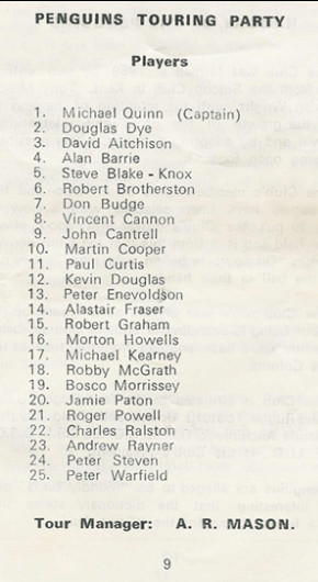Others on tour included: Mickey Quinn – Captain, Steve Blake Knox, Paul Curtis, Pete Steven, Morton Howells, Martin Cooper, Vince Cannon, Jamie Paton, Robin Challis, Peter Bell – Coach, Dave Chapman – Physio, Jeff Kellehen – Referee, Doris Mason and Alan Wright – Hon secretary.