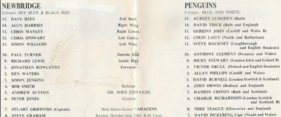 The Penguin’s played Newbridge RFC’s on Sunday 25th September 1988, as part of their centenary year celebrations.