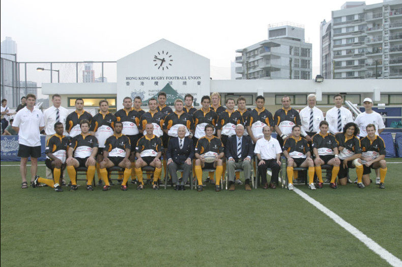 Back row: L to R Steve Hill (Academy Coach), Craig Brown (Director of Rugby, Tour Manager), Carlo di Ciacca (Edinburgh), Peter Jorgenson (Rotherham, Australia), Laurent Gomez (Harlequins), Phil Dowson (Newcastle, England 7s), Chris Johnson (Bedford), Mark Giacheri (Coventry, Italy), Sam Johnstone (Henley), Ben Gulliver (Coventry), Mike Tamiti (Botochini, NZ League 7s), Arthur Brenton (Bedford), Ben Breeze (Gwent Dragons, Wales 7s), Dave Dillon (Blackrock), Blair Urlich (Mitsubishi, NZ Maoris), Flo Rossigneux (London Welsh), David Townsend (HSBC Liaison), Bill Calcraft (Tour Coach), Dave Pierce (Physio)