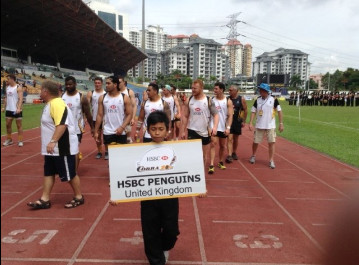 The draw allowed the HSBC Penguins a slight sleep in as we were drawn in the last cup quarter final the last match before the Olympic style march past. During the march past the HSBC Penguin team threw in excess of 50 HSBC Penguin t-shirts, polo shirts, hats and badges into the public area it was great to see some of these being worn down town KL on Monday!