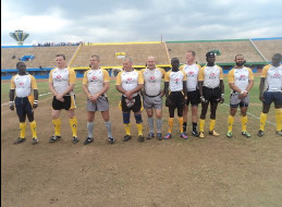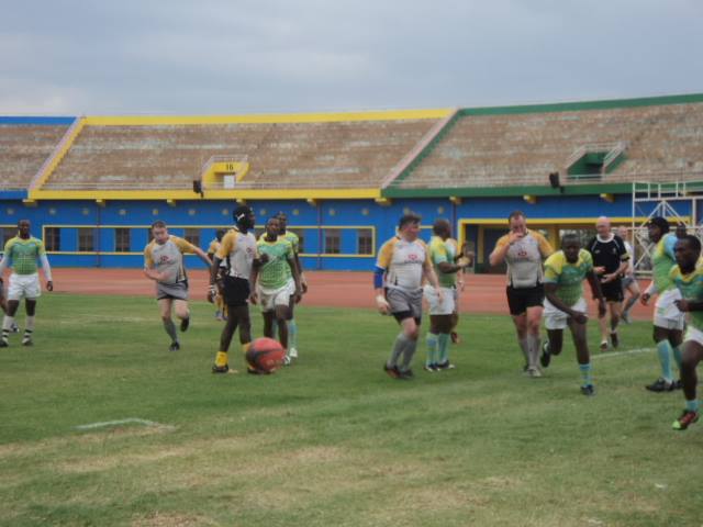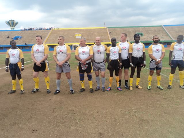 The match was held in the impressive 35,000 capacity Amahoro National Stadium, and the warm up was marked by the KPs appearing on the big screen, with a steward’s inquiry revealing, alas, that it was not a wide one.The serious stuff started with a short, sharp, team talk from Captain Tony “TP” Penn, reminding us of our duty to the jersey. In a fitting gesture, KP Wallace sung the Rwandan national anthem for our hosts. Camera man Uncle Buck shot some great video of the King Penguin team line up during the anthem. Five lung-bursting minutes later, to the delight/relief of several KPs, Rwanda opened the scoring.