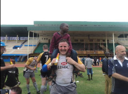 Already it was clear that the big pitch suited the pacey Rwandans, and the KPs realised that a long, hard, afternoon was on the cards. However, the competitive spirit never dies, and the KPs answered the call. “We thought you guys would collapse after 20 minutes, but you were still fighting to the end, amazing”, was the comment from one of the opposition. There were some great efforts for the cause;a long chase back and last ditch tap tackle by Raeban being the pick of the bunch. Meanwhile, the oldie threesome of,in chronological order, Cockburn, Harris, and Wallace, may have felt they had clicked the wrong button on the SAGA Holiday website. Nevertheless, they put their bodies on the line. A couple of years at least, were shaved off Cobie’s knees replacement trajectory, while Wallace’s finger pointed in one direction, and Harris’s nose in the other. Fantastically, amidst all this, the King Penguins were buoyed up with 60 screaming supporters from the Orphanage cheering every Penguin move.