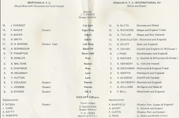 The Penguin’s were invited to play Worthing RFC to open celebrate the official opening of the new Worthing RFC Clubhouse at Angmering. The club house was officially opened by R. E. G, Jeeps CBE, Chairman of the Sports Council and Past President of the Rugby Football Union.